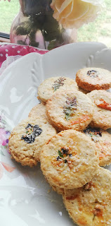 Разточваме кора с дебелина около 3-4 см.изрязваме с чашка или резец бисквитките. Разпределя е цветята и леко с точилката фиксира е. Намазва е с белтък, поръсва е със захар и печем в предварително затоплена фурна на 150С най отдолу се поставя тавата... Внимаваме да не ги прегорим🤪😊♥️