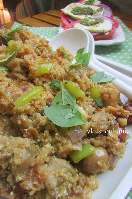 В тиган загряваме зехтина и задушаваме за 6-7 мин.нарязания на ситно лук,средните парченца,чушка и домат заедно със смачаната чеснова скилидка.Добавяме месото и киноата заедно с маслините.Разбъркваме още минутка-две и сервираме с пресен босилек!